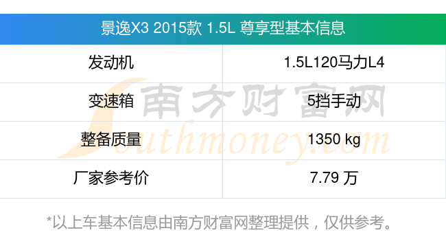 景逸X3 2015款 1.5L 尊享型动力上配备的是一台1.5L120马力L4自然吸气发动机,匹配的是5挡手动挡变速箱,燃料形式为汽油,常规整备质量1350kg,厂家参考价7.79万元。