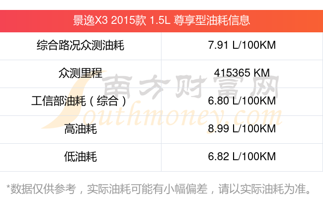 根据车主实测数据,该车型低油耗为6.82升/百公里,高油耗为8.99升/百公里,综合路况众测油耗为7.91升/百公里,工信部综合油耗为6.80升/百公里。