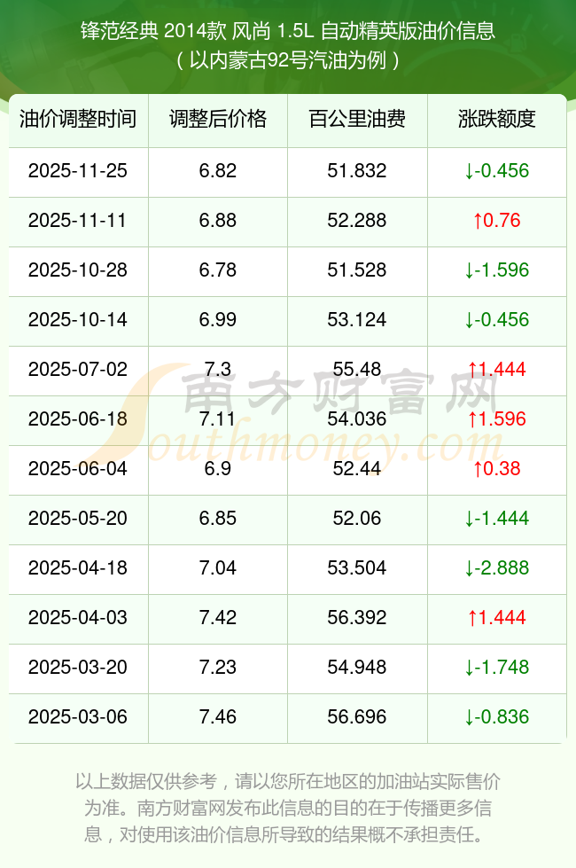 根据11月25日92号汽油最新调整价格6.82元/升来计算(以内蒙古为例),该车型每百公里的平均油费是51.832元,上一轮11月11日调整价格6.88元每升来计算,每百公里的平均油费是52.288元,对比上一轮少花0.456元,下一轮的油价调整时间是12月8日24时。