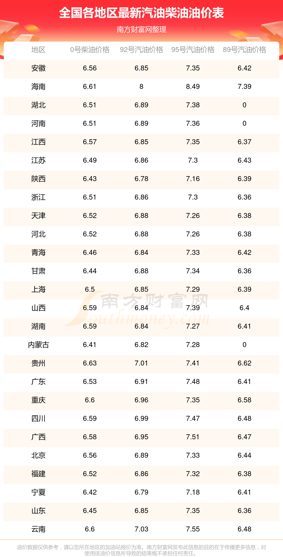 2025年12月6日全国油价调整及最新汽油价格表