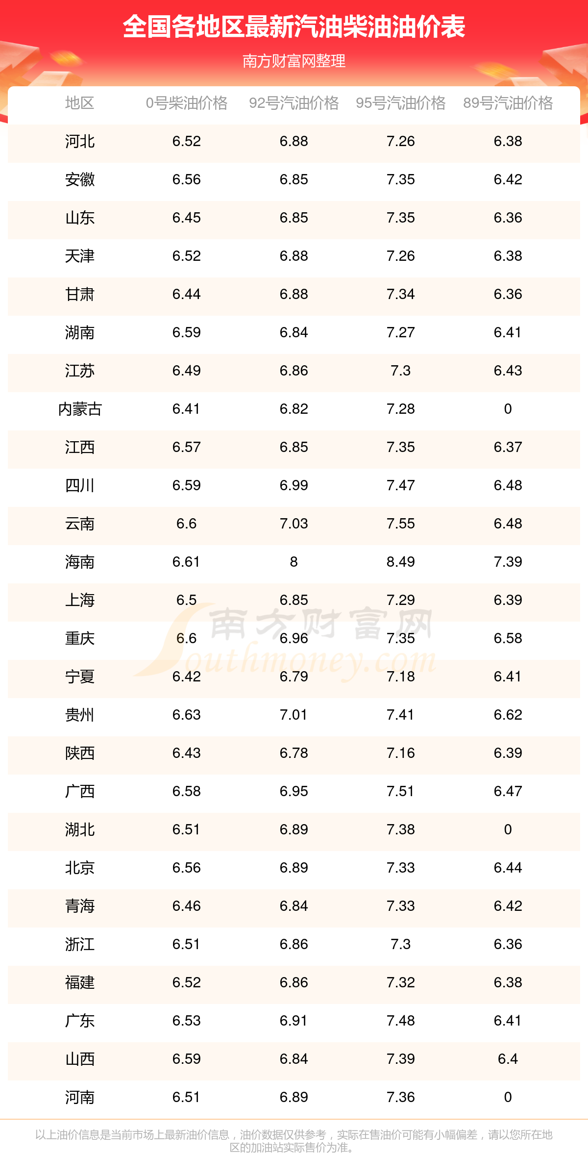 以上数据仅供参考,请以您所在地区的加油站实际售价为准。南方财富网发布此信息的目的在于传播更多信息,对使用该油价信息所导致的结果概不承担责任。
