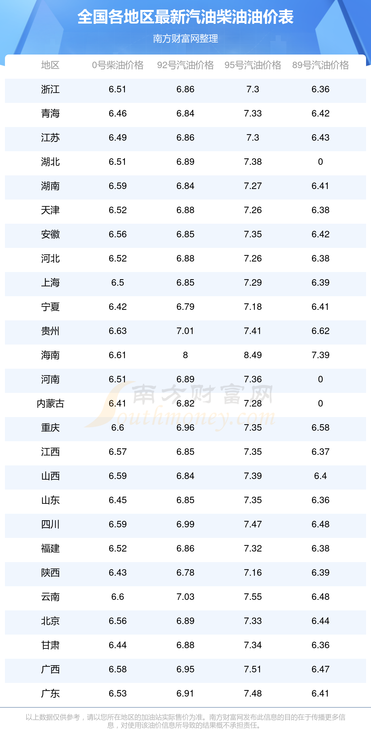 本轮油价调整时间为11月25日 ,调整后全国油价详情为: