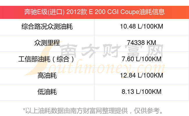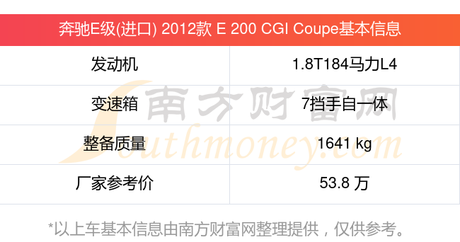 奔驰E级(进口) 2012款 E 200 CGI Coupe动力上配备的是一台1.8T184马力L4涡轮增压发动机,匹配的是7挡手自一体自动档变速箱,燃料形式为汽油,常规整备质量1641kg,厂家参考价53.8万元。