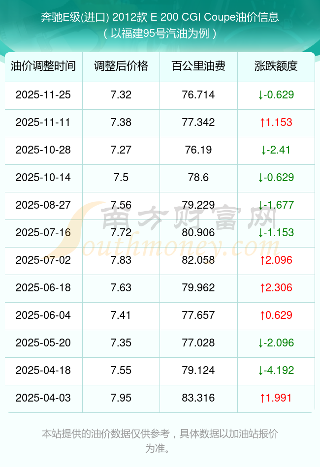 依照11月25日95号汽油最新调整价格7.32元/升来计算(以福建为例),该车型百公里的平均油费是76.714元,依照上一轮11月11日调整价格7.38元/升来计算,百公里的平均油费是77.342元,对比上一轮少花0.629元,下一轮的油价调整时间12月8日24时。