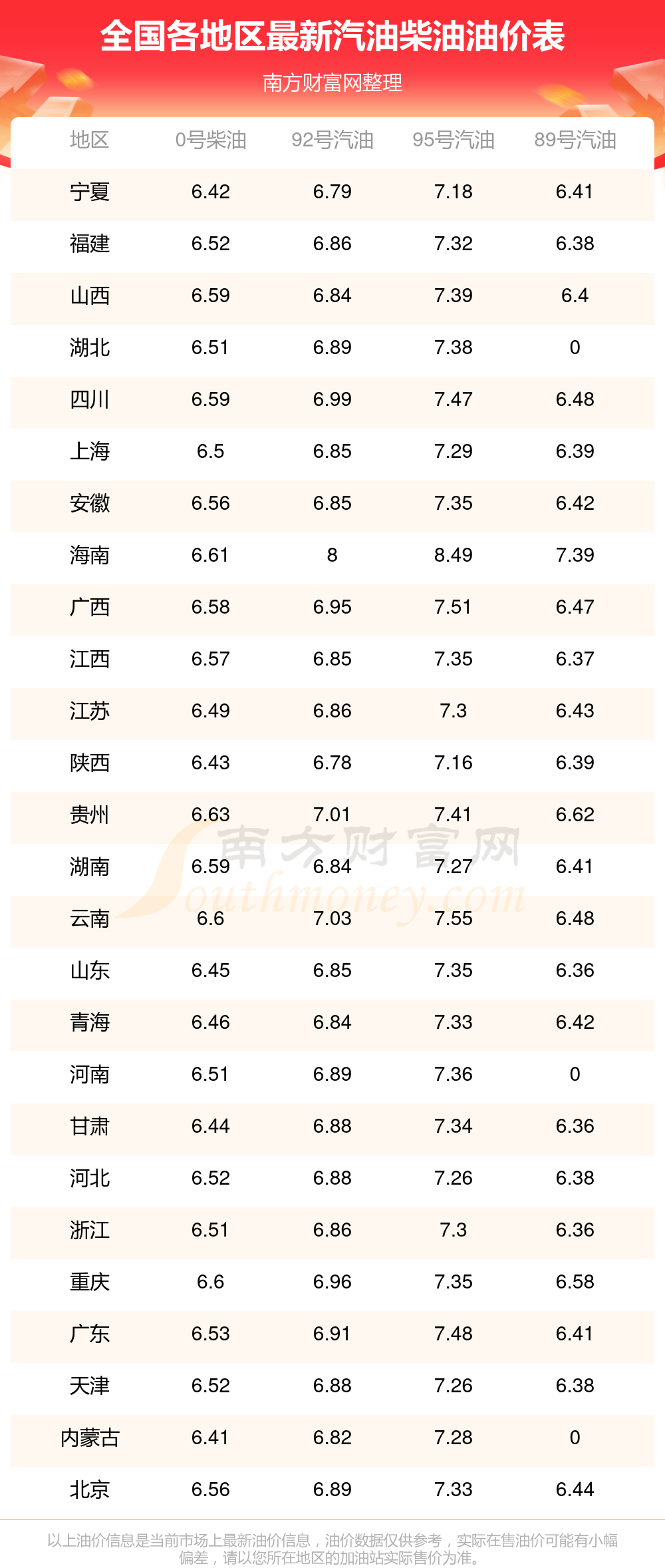 以上数据仅供参考,请以您所在地区的加油站实际售价为准。南方财富网发布此信息的目的在于传播更多信息,对使用该油价信息所导致的结果概不承担责任。