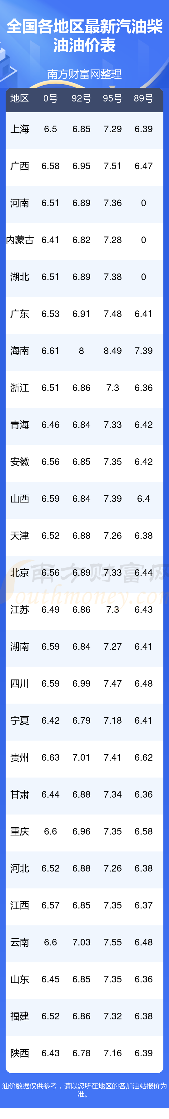 以上油价信息是当前市场上最新油价信息,油价数据仅供参考,实际在售油价可能有小幅偏差,请以您所在地区的加油站实际售价为准。