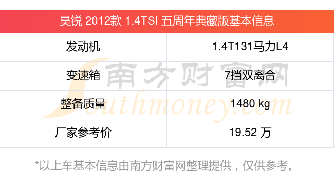 在动力上,昊锐 2012款 1.4TSI 五周年典藏版配备的是一台1.4T131马力L4涡轮增压发动机,匹配的是7挡双离合自动档变速箱,燃料形式为汽油,常规整备质量1480kg,厂家参考价19.52万元。