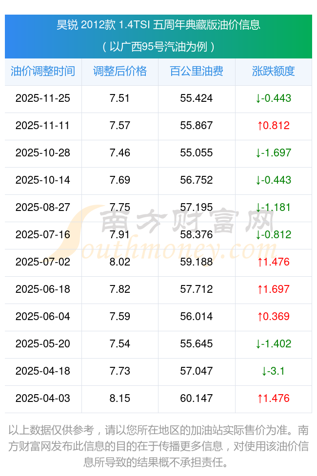 按11月25日95号汽油最新调整价格7.51元每升来计算(以广西为例),该车型百公里平均油费为55.424元,按上一轮11月11日调整价格7.57元每升来计算,百公里平均油费为55.867元,对比上一轮少花0.443元,下一轮油价调整时间为12月8日24时。