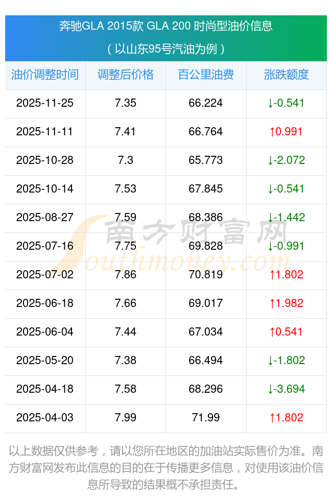 依照11月25日95号汽油最新调整价格7.35元/升来计算(以山东为例),该车型百公里的平均油费是66.224元,依照上一轮11月11日调整价格7.41元/升来计算,百公里的平均油费是66.764元,对比上一轮少花0.541元,下一轮的油价调整时间12月8日24时。
