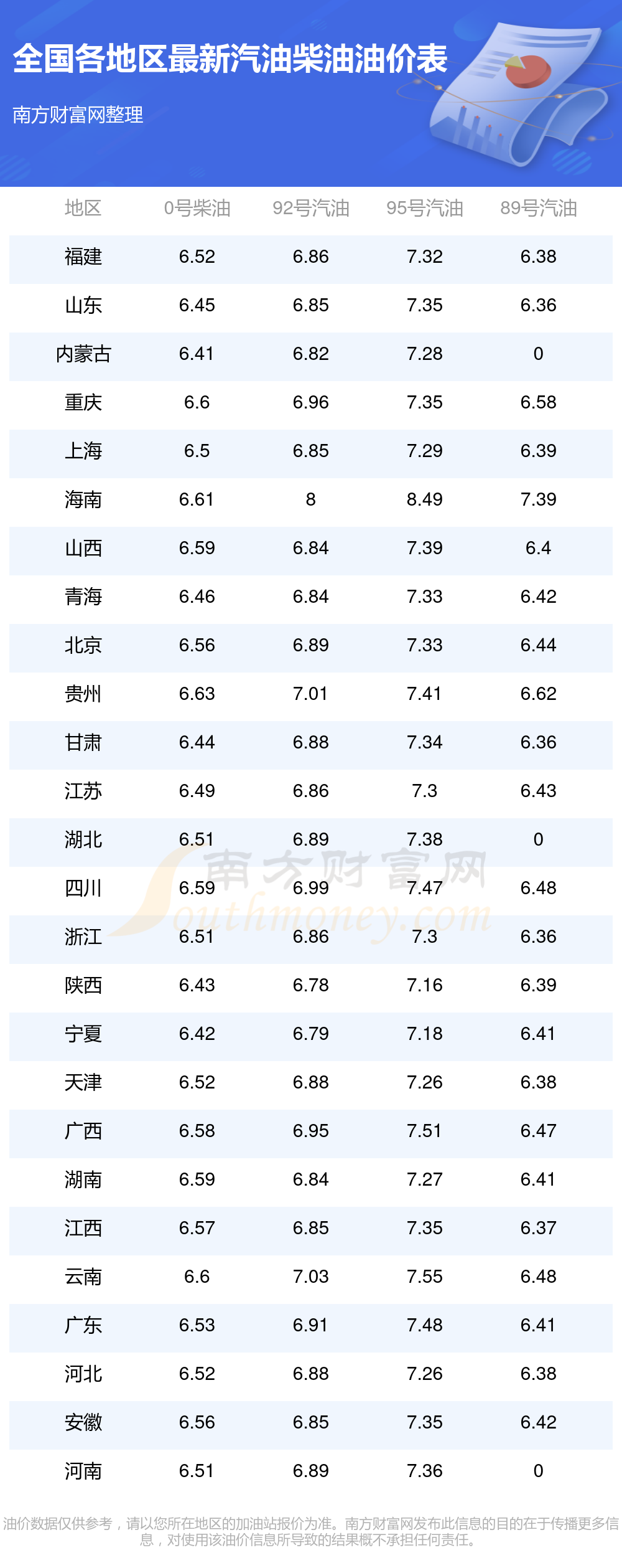以上油价信息是当前市场上最新油价信息,油价数据仅供参考,实际在售油价可能有小幅偏差,请以您所在地区的加油站实际售价为准。