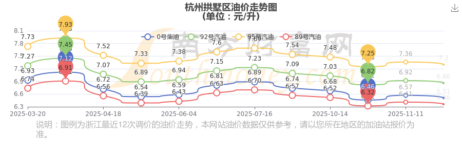 12月6日,杭州拱墅区汽油、柴油每升最新价格:本轮的油价调整时间是11月25日,92号汽油为6.86元,下跌了0.06元,下跌幅达0.87%;95号汽油为7.3元,下跌了0.06元,下跌幅达0.82%;89号汽油为6.36元,下跌了0.05元,下跌幅达0.78%;0号柴油为6.51元,下跌了0.06元,下跌幅达0.91%。