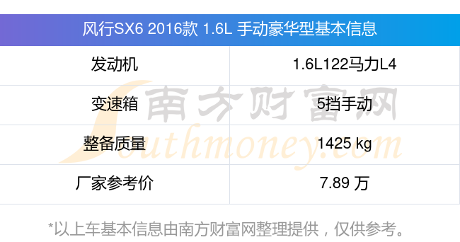 风行SX6 2016款 1.6L 手动豪华型动力方面,搭载的是一台1.6L122马力L4自然吸气发动机,匹配5挡手动挡变速箱,燃料形式为汽油,常规整备质量1425kg,厂家参考价7.89万元。
