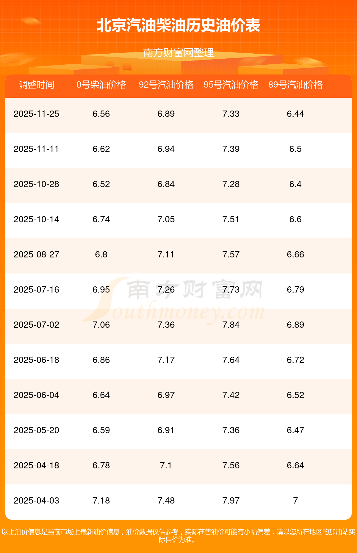 按11月25日92号汽油最新调整价格6.89元每升来计算(以北京为例),该车型百公里平均油费为54.982元,按上一轮11月11日调整价格6.94元每升来计算,百公里平均油费为55.381元,对比上一轮少花0.399元,下一轮油价调整时间为12月8日24时。