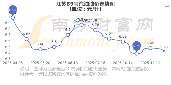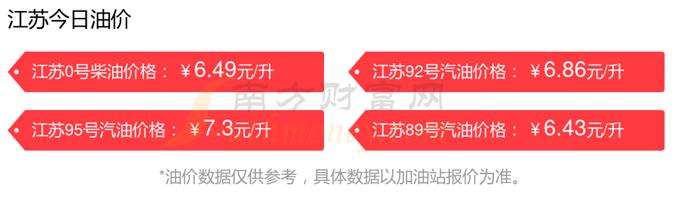 江苏汽油、柴油12月6日每升最新价格为11月25日调整后的价格,具体为:92号汽油6.86元,降了0.06元;95号汽油7.3元,降了0.06元;89号汽油6.43元,降了0.05;0号柴油6.49元,降了0.06元。
