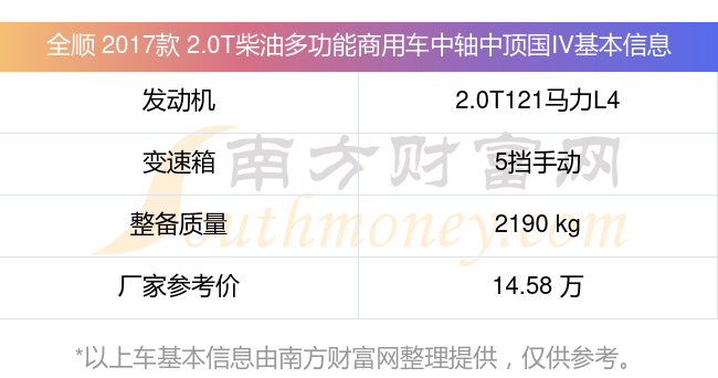 全顺 2017款 2.0T柴油多功能商用车中轴中顶国IV动力上搭载的是一台2.0T121马力L4涡轮增压发动机,匹配5挡手动挡变速箱,燃料形式为柴油,常规整备质量2190kg,厂家参考价14.58万元。