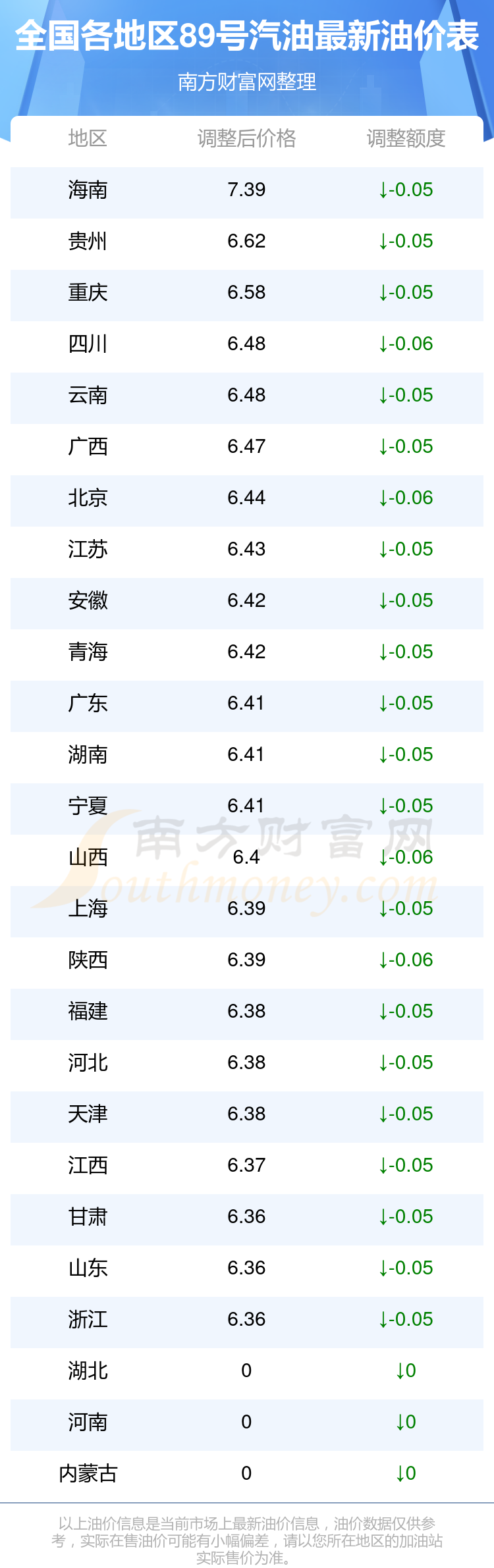 12月6日,上海89号汽油的价格是6.39元每升,本次的调整时间为11月25日,对比上次的调整下跌了0.05元,下跌0.776%,12月8日24时为下一轮油价调整时间,还有2.09天。