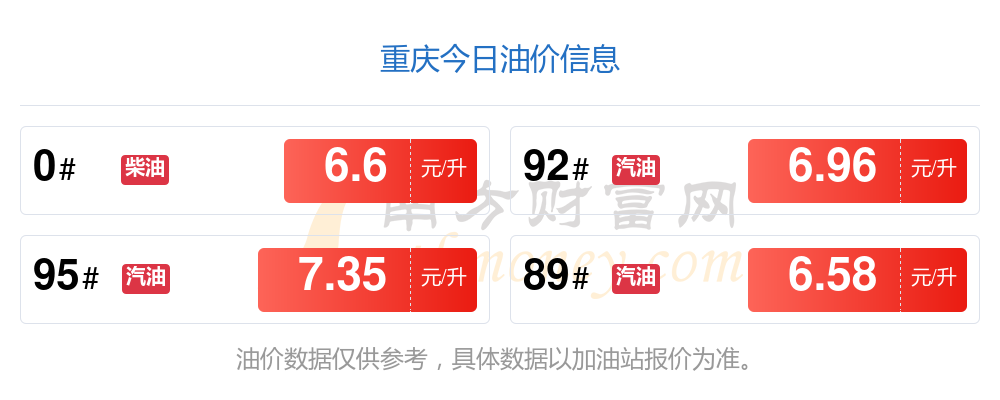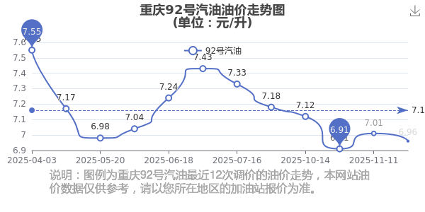 油价调整最新消息:12月6日的重庆汽油、柴油每升最新价格(调整时间为11月25日):92号汽油为6.96元,下调了0.05元,下调幅达0.71%;95号汽油为7.35元,下调了0.06元,下调幅达0.81%;89号汽油为6.58元,下调了0.05元,下调幅达0.75%;0号柴油为6.6元,下调了0.05元,下调幅达0.75%。重庆下一轮油价调整时间12月8日24时,距离现在还有2.08天。