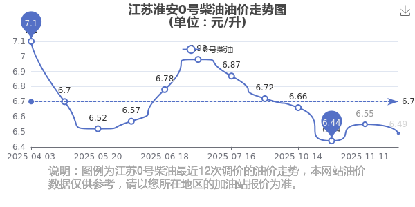 12月6日汽油、柴油每升的价格详情如下:92号汽油6.86元,降了0.06元;95号汽油7.3元,降了0.06元;89号汽油6.43元,降了0.05元;0号柴油6.49元,降了0.06元,本次油价的调整时间为11月25日。