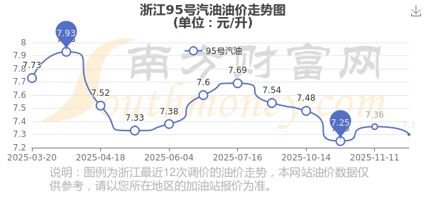 12月7日,浙江95号汽油的价格是7.3元每升,本次的调整时间为11月25日,对比上次的调整降了0.06元,降0.815%,12月8日24时为下一轮油价调整时间,还有1.87天。