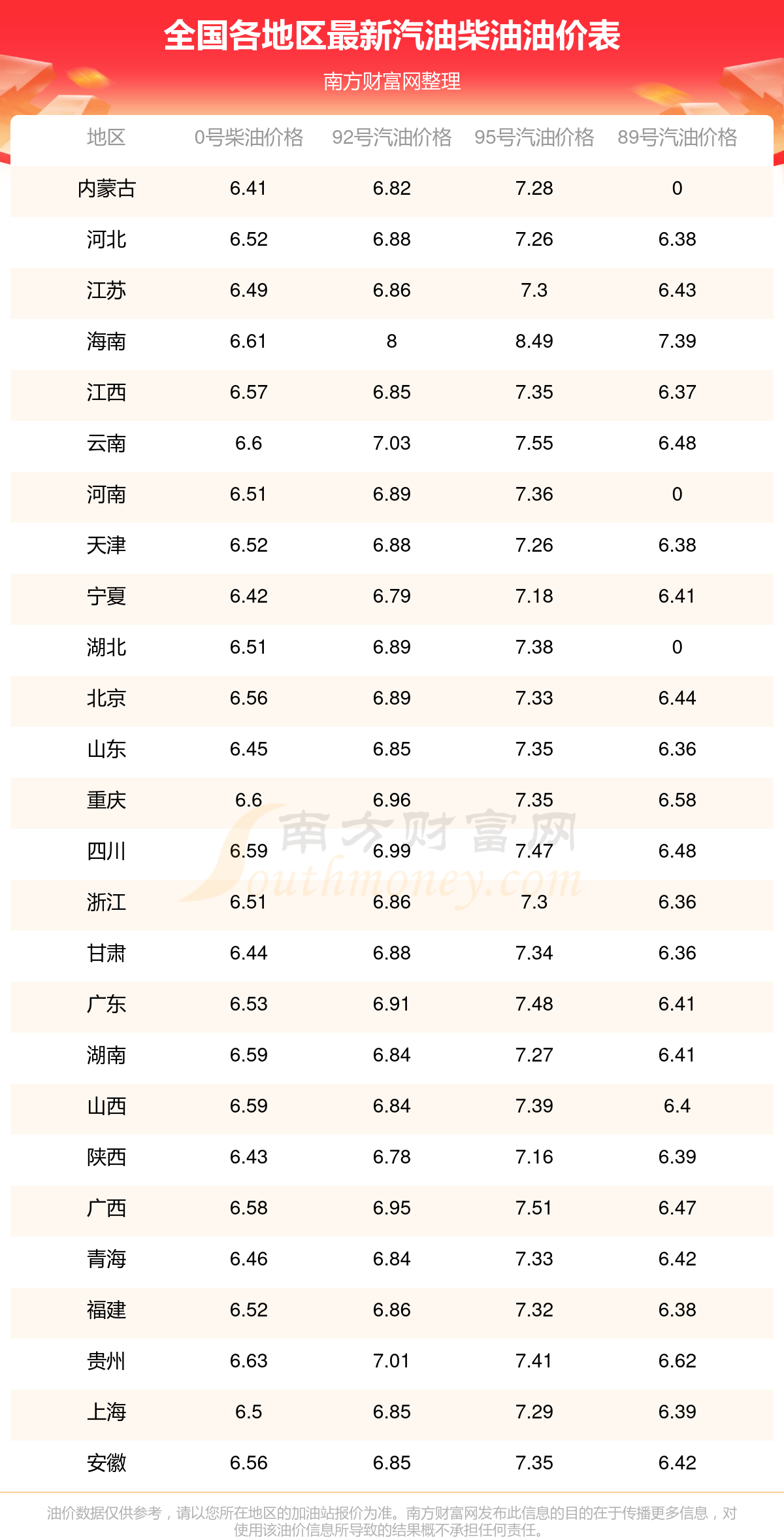 油价数据仅供参考,请以您所在地区的各加油站报价为准。