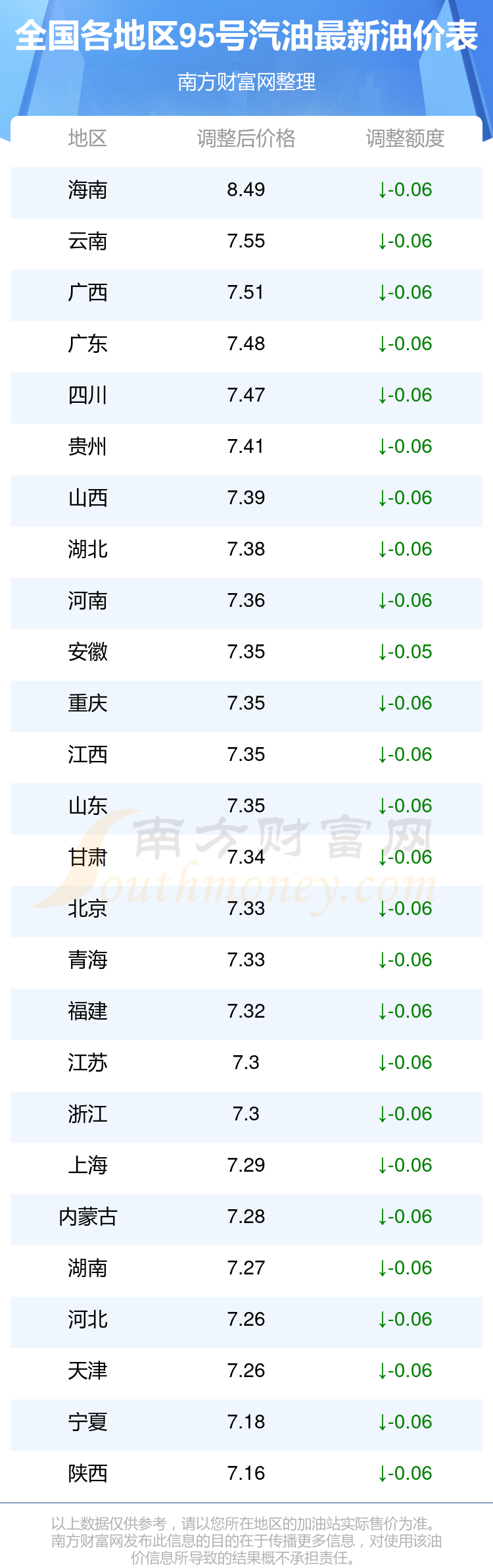全国各地区95号汽油油价一览表