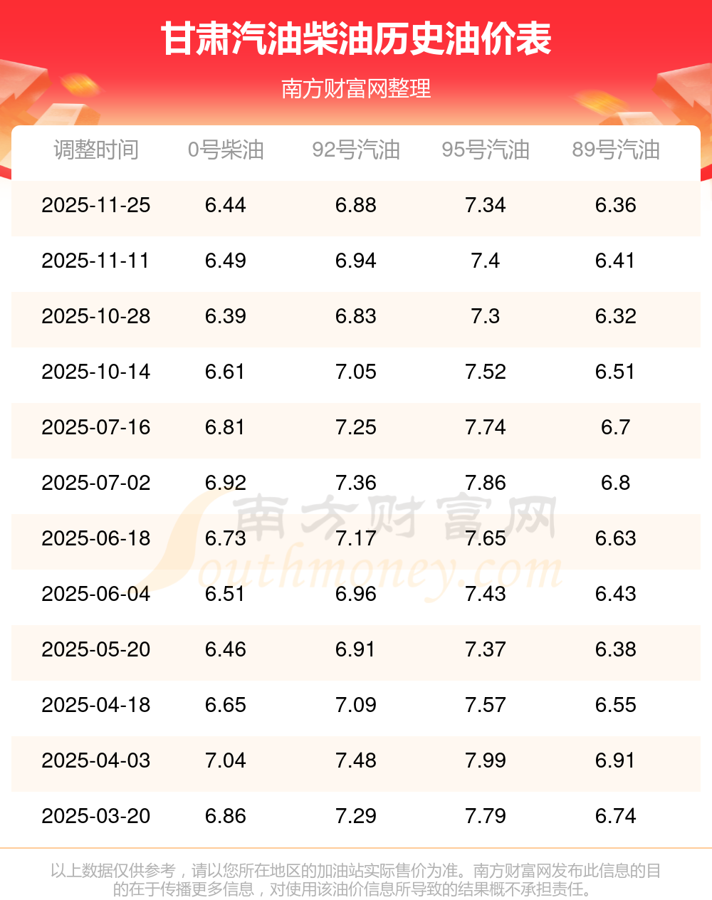 12月7日甘肃汽油、柴油的价格为11月25日调整后的价格。每升最新价格为:92号汽油6.88元,跌了0.06元;95号汽油7.34元,跌了0.06元;89号汽油6.36元,跌了0.05;0号柴油6.44元,跌了0.05元。