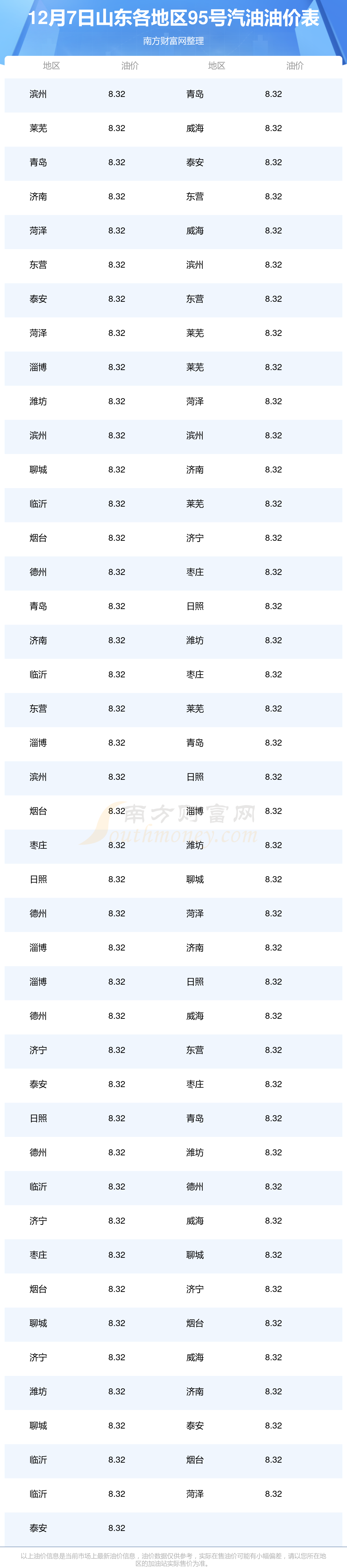12月7日,山东95号汽油的价格是7.35元每升,本次的调整时间为11月25日,对比上次的调整减了0.06元,减0.81%,12月8日24时为下一轮油价调整时间,还有1.82天。