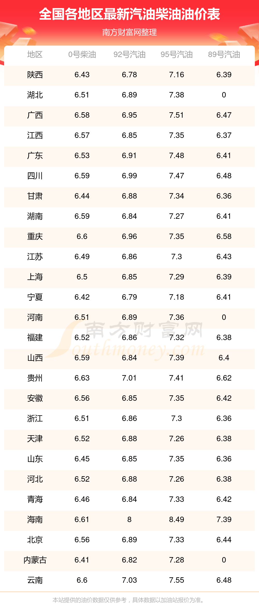 以上油价信息是当前市场上最新油价信息,油价数据仅供参考,实际在售油价可能有小幅偏差,请以您所在地区的加油站实际售价为准。