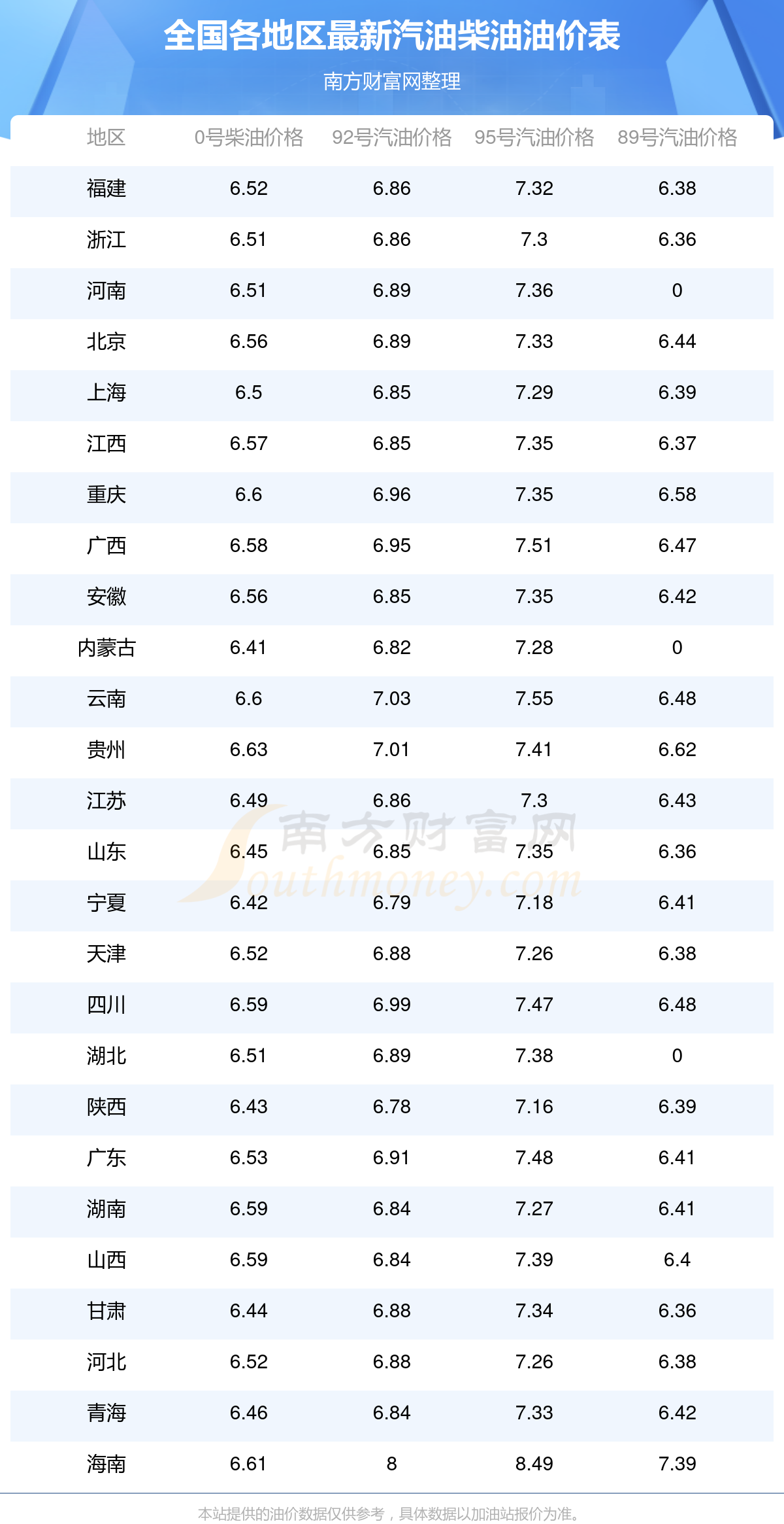 油价数据仅供参考,请以您所在地区的加油站报价为准。南方财富网发布此信息的目的在于传播更多信息,对使用该油价信息所导致的结果概不承担任何责任。
