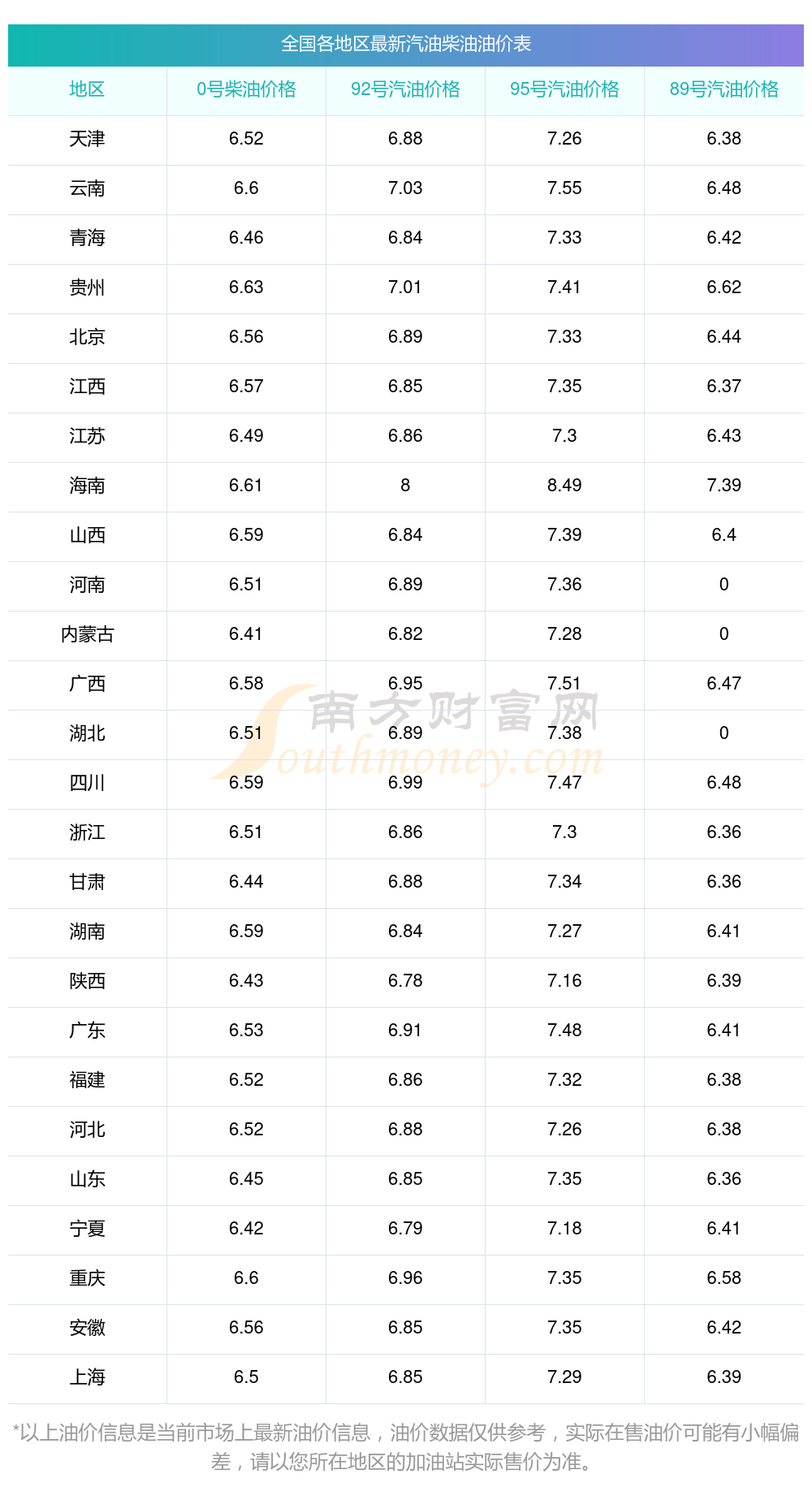 以上油价信息是当前市场上最新油价信息,油价数据仅供参考,实际在售油价可能有小幅偏差,请以您所在地区的加油站实际售价为准。