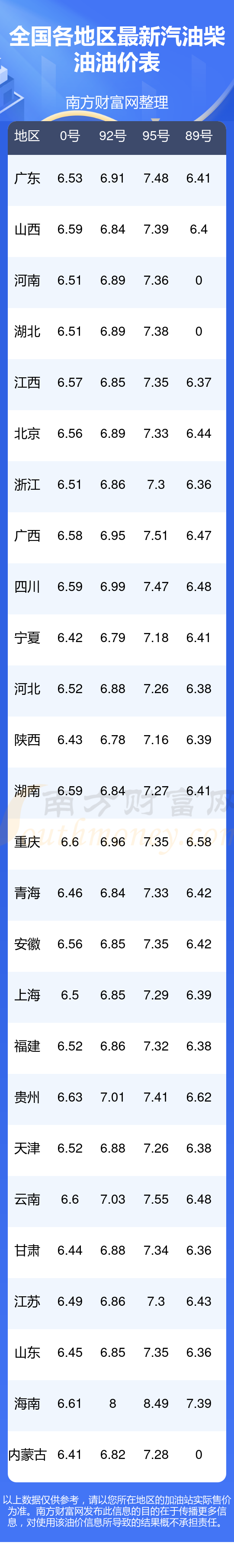 全国各地区最新油价表