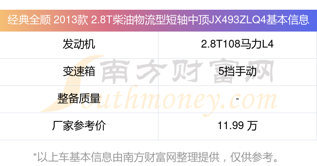 经典全顺 2013款 2.8T柴油物流型短轴中顶JX493ZLQ4动力上搭载的是一台2.8T108马力L4涡轮增压发动机,匹配5挡手动挡变速箱,燃料形式为柴油,厂家参考价11.99万元。