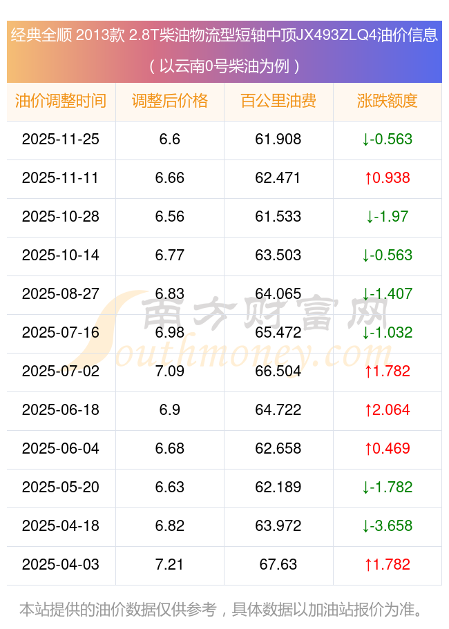 按照11月25日0号柴油最新调整价格6.6元/升来计算(以云南为例),该车型百公里平均油费为61.908元,按照上一轮11月11日调整价格6.66元/升来计算,百公里平均油费为62.471元,对比上一轮少花0.563元,下一轮油价调整时间为12月8日24时。