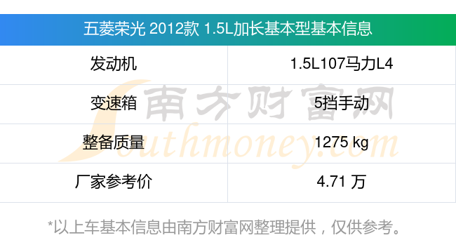 五菱荣光 2012款 1.5L加长基本型动力方面,搭载的是一台1.5L107马力L4自然吸气发动机,匹配5挡手动挡变速箱,燃料形式为汽油,常规整备质量1275kg,厂家参考价4.71万元。