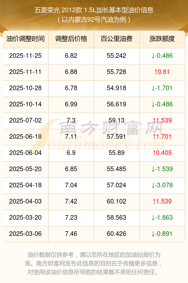 依照11月25日92号汽油最新调整价格6.82元/升来计算(以内蒙古为例),该车型百公里的平均油费是55.242元,依照上一轮11月11日调整价格6.88元/升来计算,百公里的平均油费是55.728元,对比上一轮少花0.486元,下一轮的油价调整时间12月8日24时。