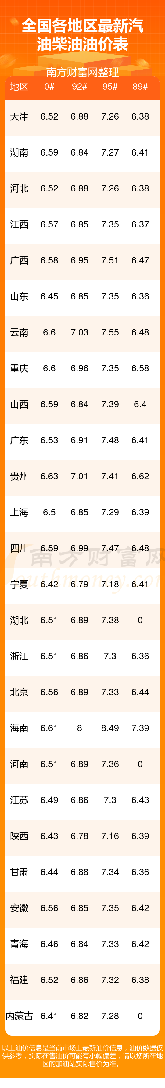 以上数据仅供参考,请以您所在地区的加油站实际售价为准。南方财富网发布此信息的目的在于传播更多信息,对使用该油价信息所导致的结果概不承担责任。