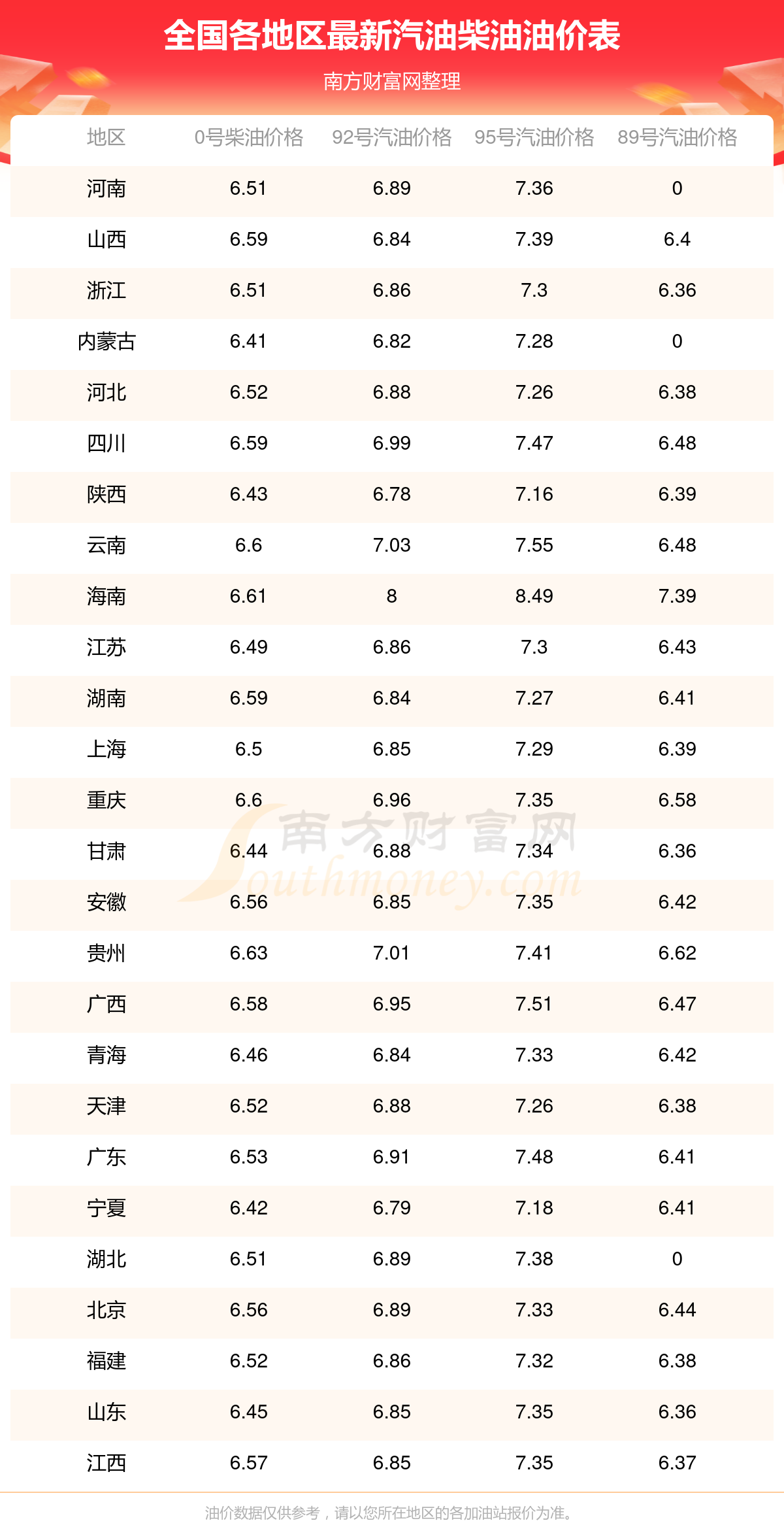 全国各地区最新油价表