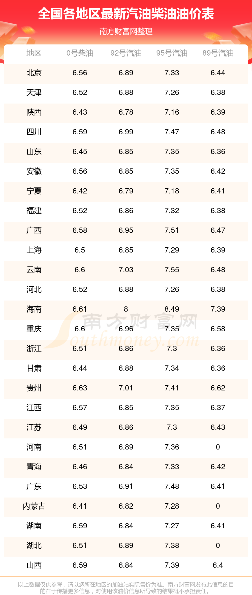 以上油价信息是当前市场上最新油价信息,油价数据仅供参考,实际在售油价可能有小幅偏差,请以您所在地区的加油站实际售价为准。