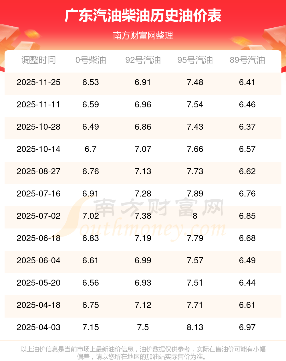 12月7日,广东95号汽油的价格是7.48元每升,本次的调整时间为11月25日,对比上次的调整跌了0.06元,跌0.796%,下次调整时间为12月8日24时,还有1.62天。