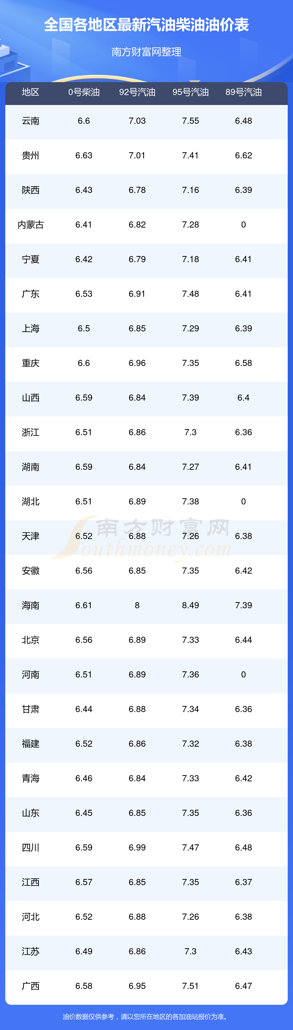 以上数据仅供参考,请以您所在地区的加油站实际售价为准。南方财富网发布此信息的目的在于传播更多信息,对使用该油价信息所导致的结果概不承担责任。