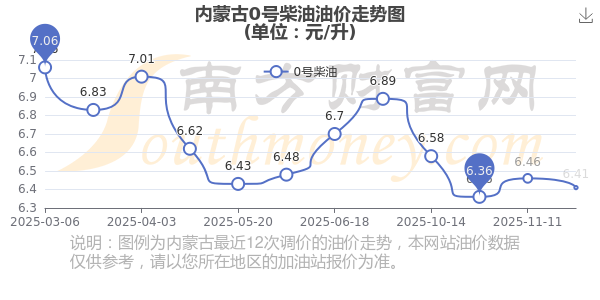 12月7日,内蒙古0号柴油的价格是6.41元每升,本次的调整时间为11月25日,对比上次的调整下降了0.05元,下降0.774%,12月8日24时为下一轮油价调整时间,还有1.62天。