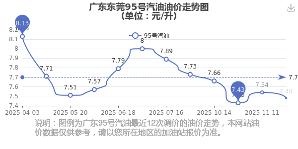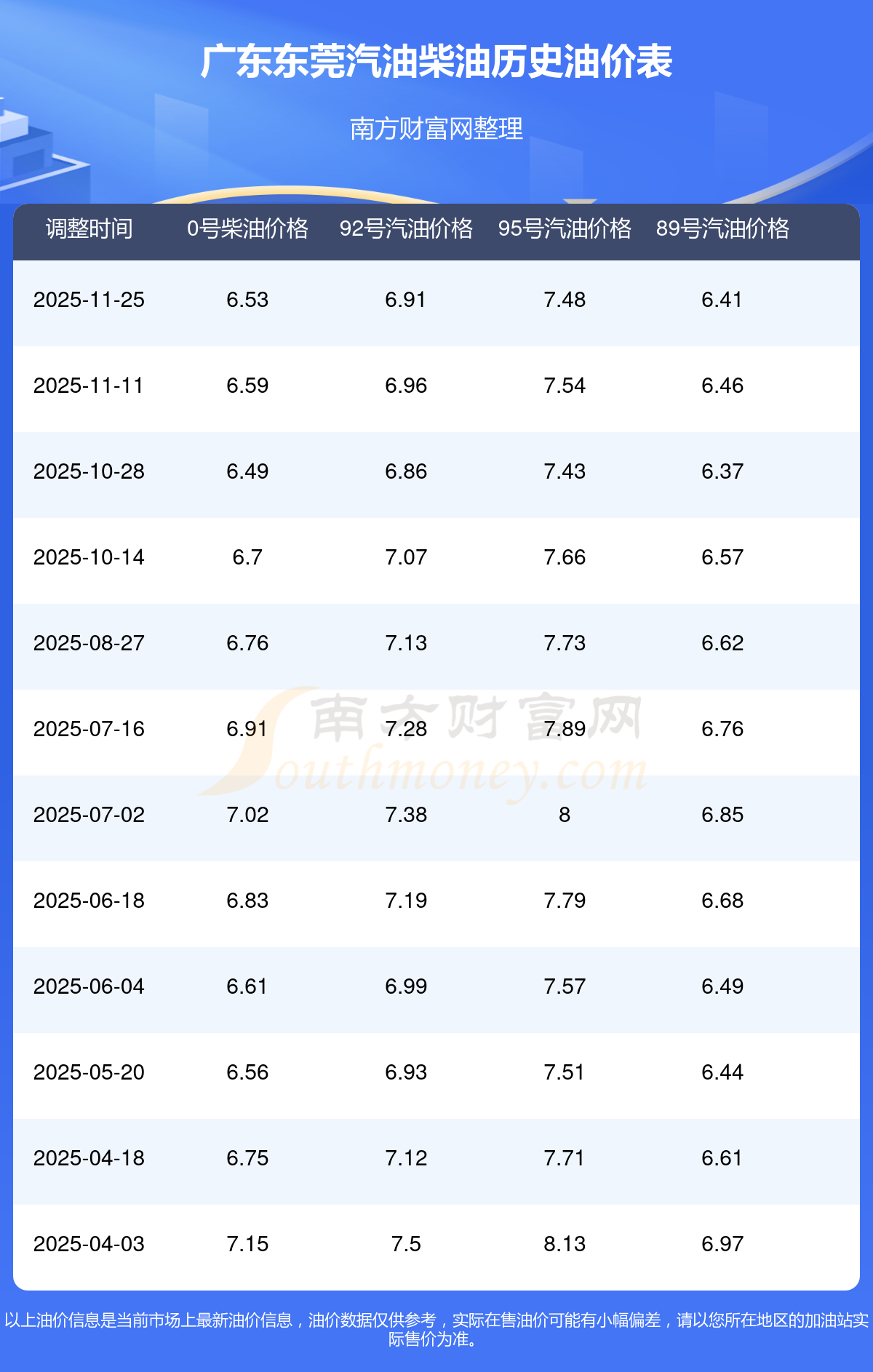 广东东莞汽油、柴油12月7日每升的价格是多少?具体为:92号汽油为6.91元,降了0.05元;95号汽油为7.48元,降了0.06元;89号汽油为6.41元,降了0.05元;0号柴油为6.53元,降了0.06元,本轮油价的调整时间为11月25日。
