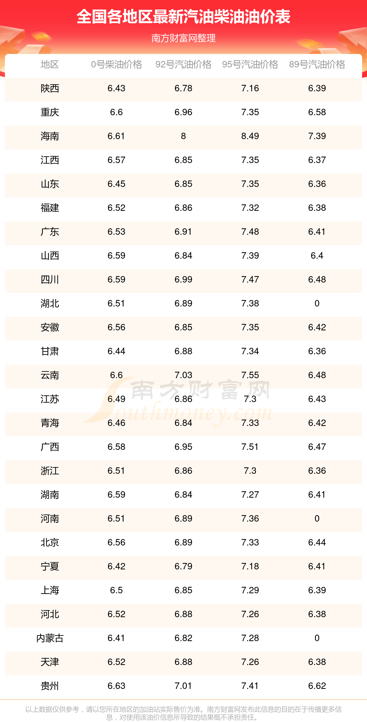 2025年12月7日全国各地油价调整及最新汽油价格表