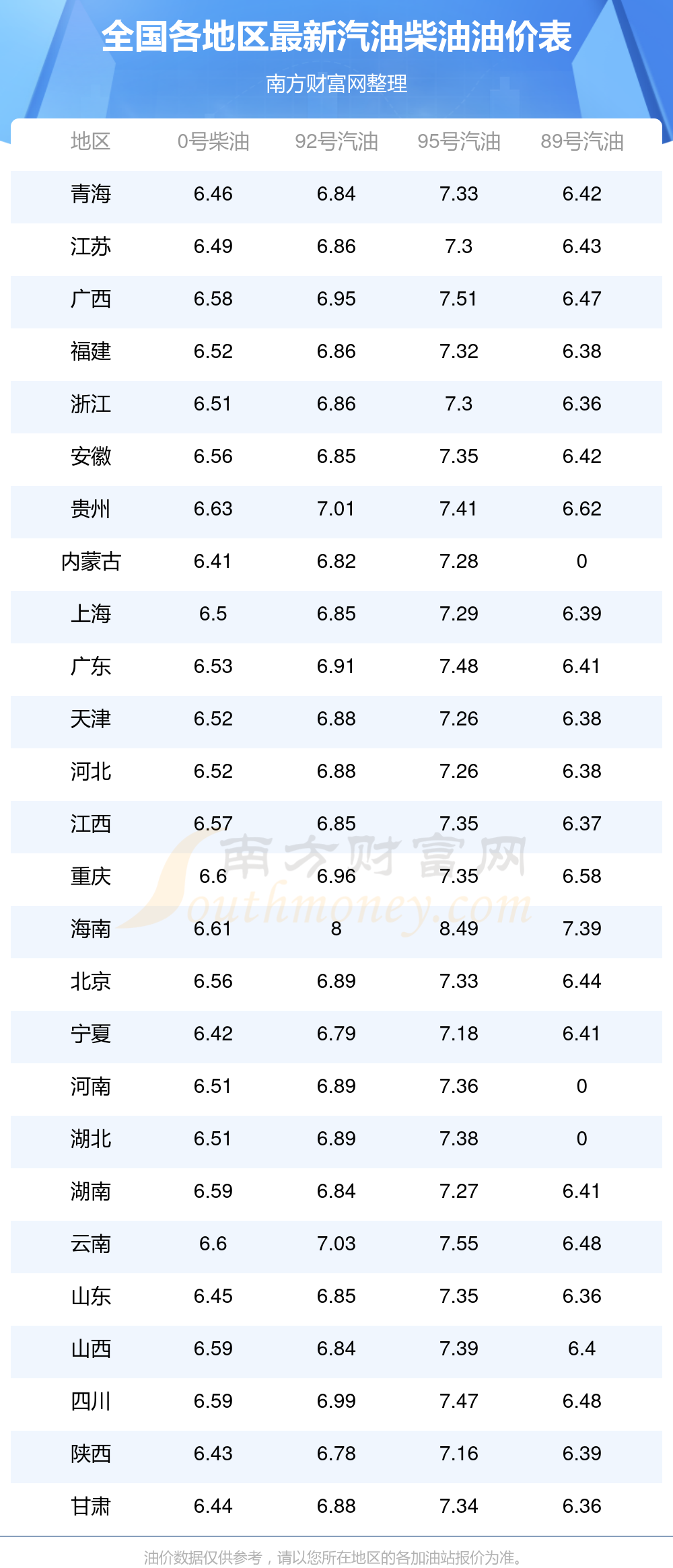全国89号汽油最新平均价格为:6元每升,其中,最低为浙江,价格为6.36元/升,最高为海南,价格为7.39元/升。