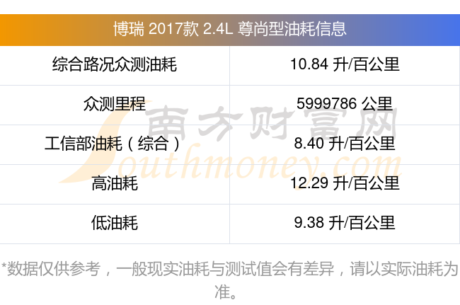 根据多位车主实测得出数据,该车型低油耗为9.38升每百公里,高油耗为12.29升每百公里,综合路况众测油耗为10.84升每百公里,工信部综合油耗为8.40升每百公里。