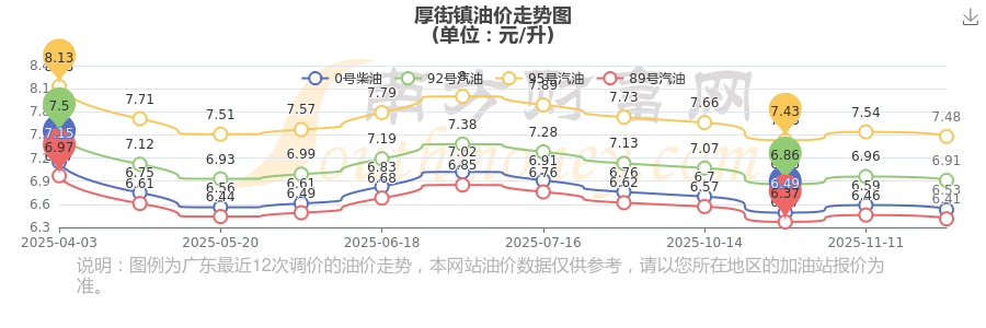 厚街镇汽油、柴油12月7日价格多少钱一升?具体为:0号柴油为6.53元,下调了0.06元;95号汽油为7.48元;92号汽油为6.91元;89号汽油为6.41元,调整时间为11月25日。