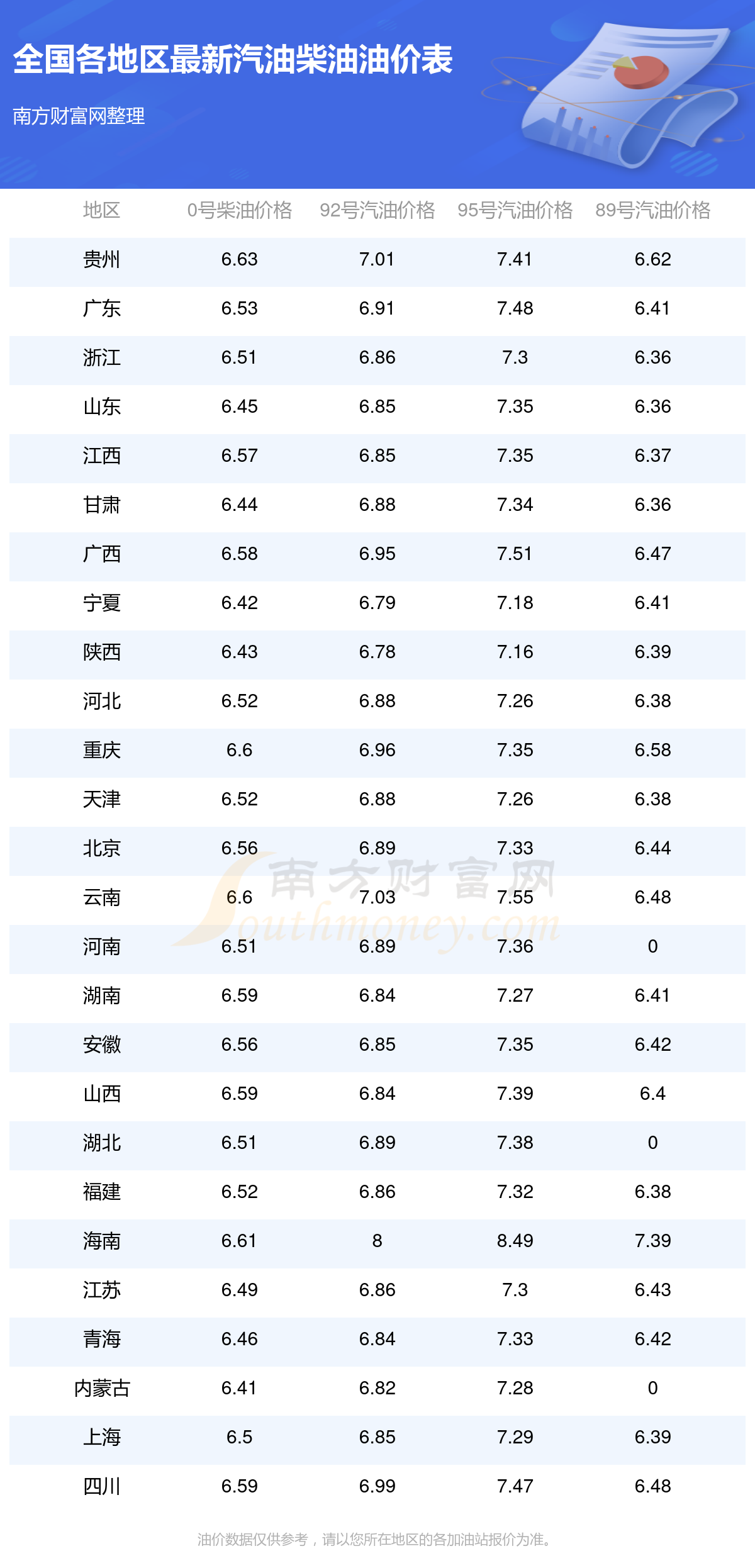 油价数据仅供参考,请以您所在地区的各加油站报价为准。