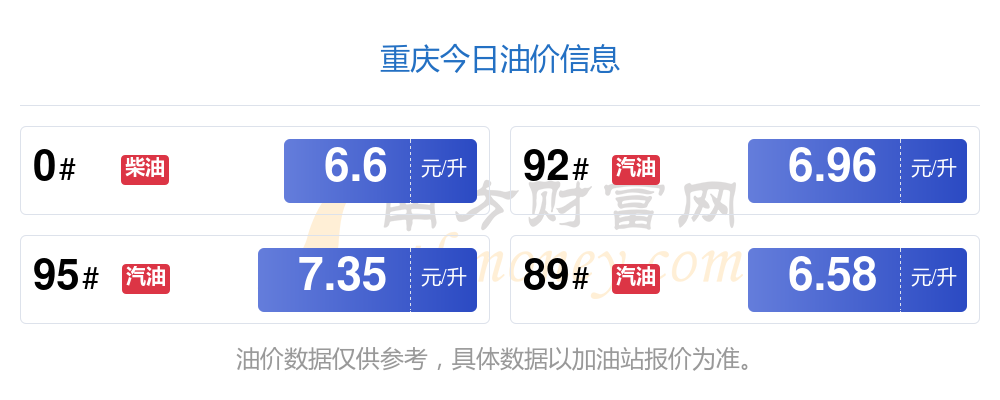 汽油价格调整最新消息:下一轮油价调整时间12月8日24时。重庆汽油、柴油12月7日每升最新价格查询:本轮油价调整时间为11月25日,92号汽油6.96元,下降了0.05元;95号汽油7.35元,下降了0.06元;89号汽油6.58元,下降了0.05;0号柴油6.6元,下降了0.05元。