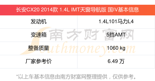 长安CX20 2014款 1.4L IMT天窗导航版 国IV搭载了一台1.4L101马力L4自然吸气发动机,采用5挡AMT自动档变速箱,常规整备质量1060kg,厂家参考价6.49万元。