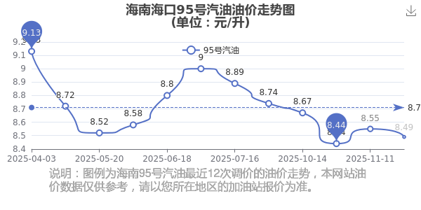 12月7日海南海口95号汽油的价格为11月25日油价调整后的价格,每升8.49元,对比上一轮油价调整时间11月11日的价格8.55元每升,降了0.06元,降幅达0.702%。